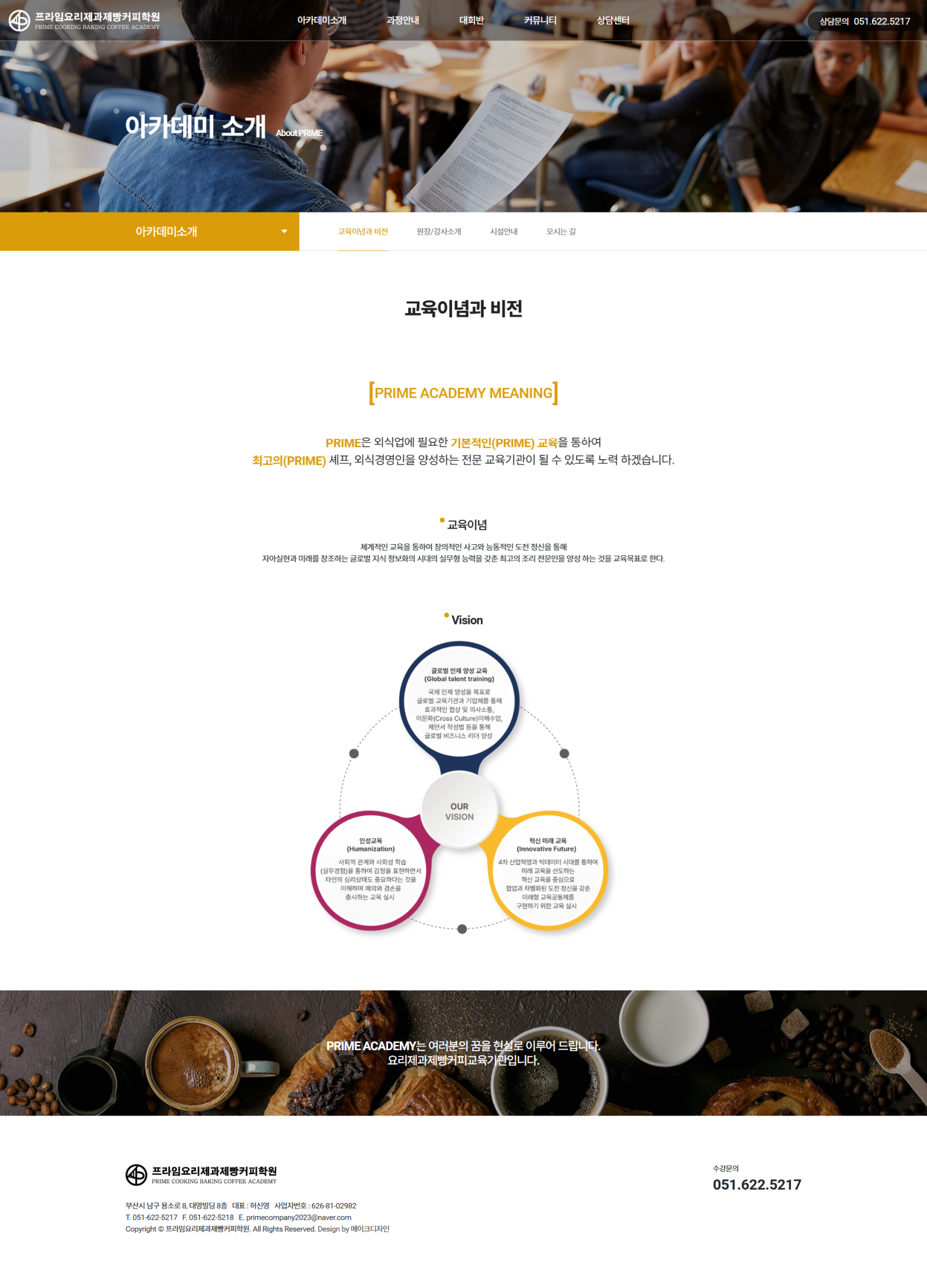 프라임요리제과제빵커피학원 서브페이지 디자인 및 서브 퍼블리싱 진행